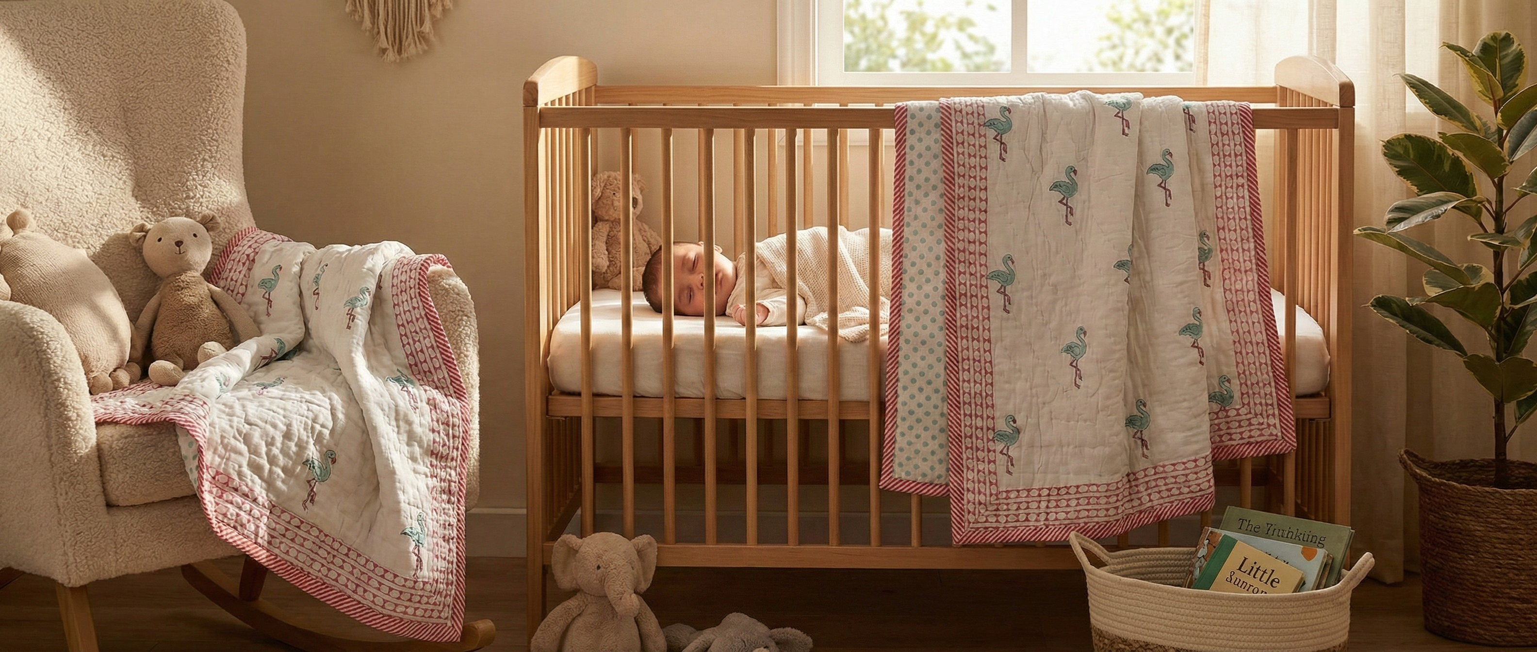 Set on a soft white base, this quilt features delicately spaced flamingo motifs that give it a light, airy feel. The illustrations are simple and calm, making the design soothing rather than busy. On the reverse, small heart shapes are arranged in a gentle polka-style pattern, adding a quiet detail that works well for a gender-neutral nursery.
